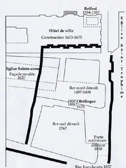 Au XVe siècle, la démolition dun premier îlot dhabitation, inaugure les profondes modifications qui toucheront le site : édification du beffroi au XVIe siècle, recul de la façade de Sainte-Anne, construction de lhôtel de ville et érection de lobélisque au XVIIe. Ainsi naît la place du marché, qui deviendra place royale et enfin, place de la République.