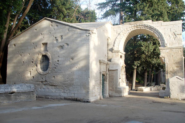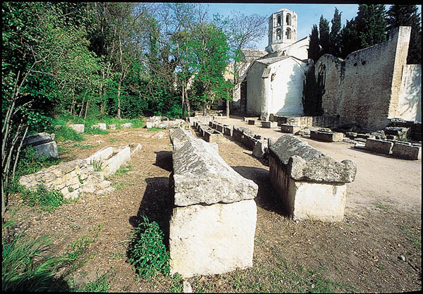 Vers le milieu du XIe siècle, une partie du site fut cédé à la puissante abbaye Saint-Victor de Marseille, qui plaça le sanctuaire sous la protection de saint Honorat, évêque dArles entre 426 et 429. Cest le nom de ce dernier qui fut donné à léglise reconstruite au XIIe. A cette époque, la nécropole devint par ailleurs le point de départ du chemin dArles vers Saint-Jacques de Compostelle. Ce lieu bénéficia des mythes et légendes qui fleurirent alors, jusquà lui conférer une atmosphère d« héroïque grandeur ».