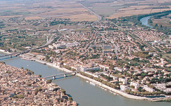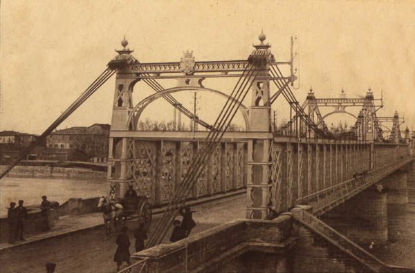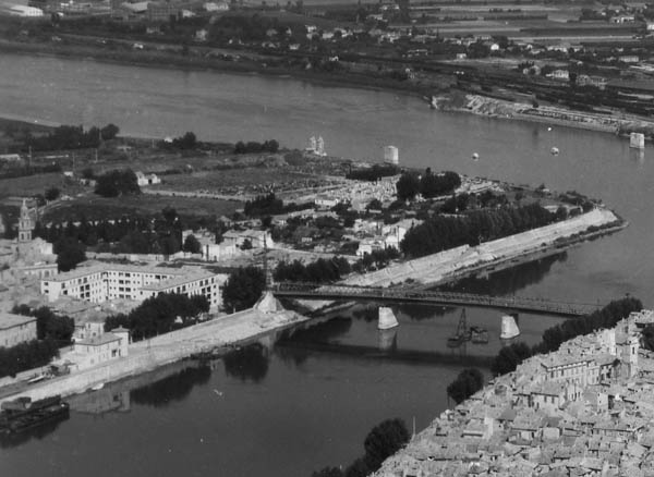 Le pont de bateaux nest remplacé par un ouvrage bâti quen 1875. Il sera détruit, comme le «pont aux lions » (voie ferrée de Lunel, 1865), lors des bombardements de 1944. En 1970, le pont de la voie expresse vient doubler lunique lien entre les deux rives de la ville.